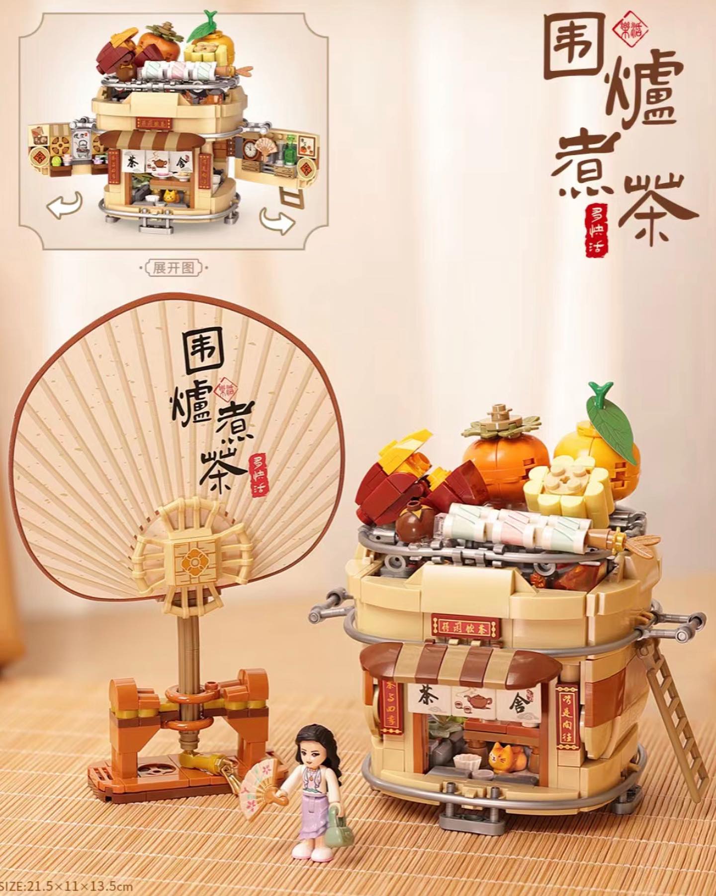 爐頂放置橘子柿子玉米,還搭配一把小蒲扇小炭爐本身亦是一個可展開小店